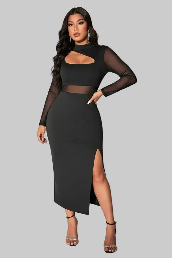 This dress blends elegance with a hint of allure. The high waistline flatters the figure, while the long sleeves create a balanced, polished look. Made from a medium-stretch knitted fabric, it offers both comfort and structure — perfect for dinners, events, and glamorous nights out.